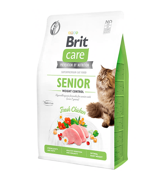 Fórmula hipoalergénica para gatos mayores de más de 7 años. Además reforzado con nutrientes esenciales para ayudar a las articulaciones y que los dientes se mantengan fuertes. Brit Care Cat Senior Weight Control tiene proteína fresca de pollo.